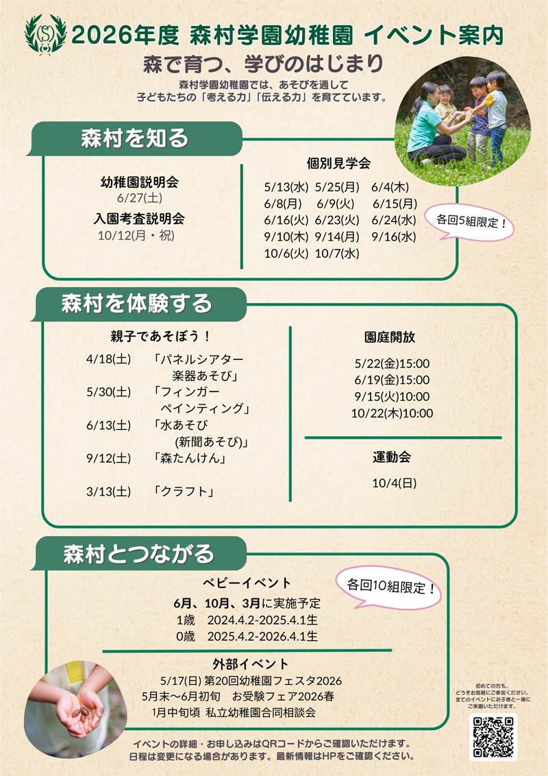 | 園庭開放 | 2026年5月22日(金) 15:00 2026年6月19日(金) 15:00 2026年9月15日(火) 10:00 2026年10月22日(木) 10:00 |